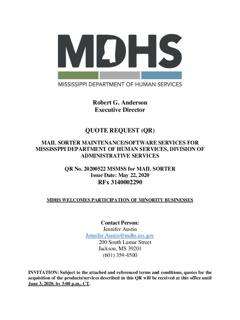 Robert G. Anderson Executive Director QUOTE REQUEST (QR) MAIL SORTER MAINTENANCE/SOFTWARE SERVICES FOR MISSISSIPPI DEPARTMENT OF HUMAN SERVICES, DIVISION OF ADMINISTRATIVE SERVICES QR No. 20200522