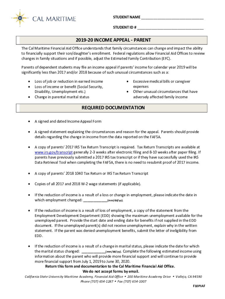 STUDENT NAME STUDENT ID # 201920 INCOME APPEAL PARENT The Cal Maritime Financial Aid Office understands that family circumstances can change and impact the ability to financially support their son/daughters