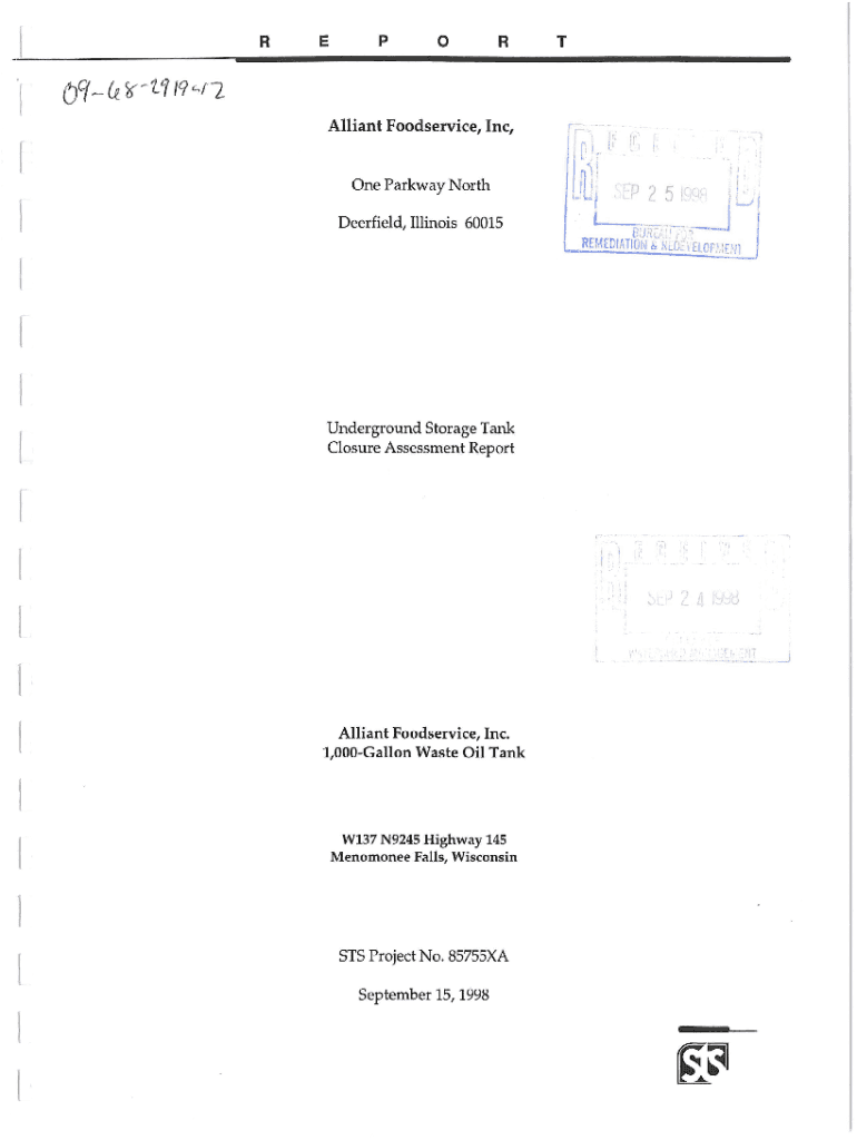 REp0RTAlliant Food service, Inc, One Parkway North Deerfield, Illinois 60015Underground Storage Tank Closure Assessment Report!.. I I41Alliant Food service, Inc. 1,000Gallon Waste Oil TankW137 N9245