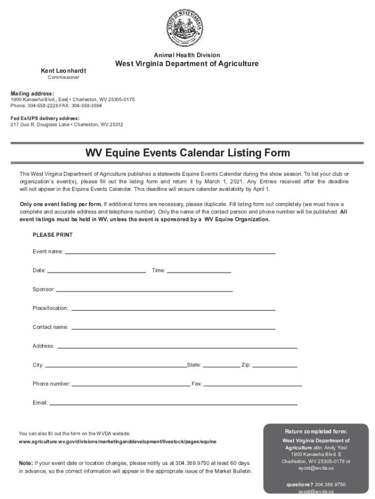 The purpose of the WV equine events form is to track and regulate equine events in the state of West Virginia for safety and regulatory purposes.
