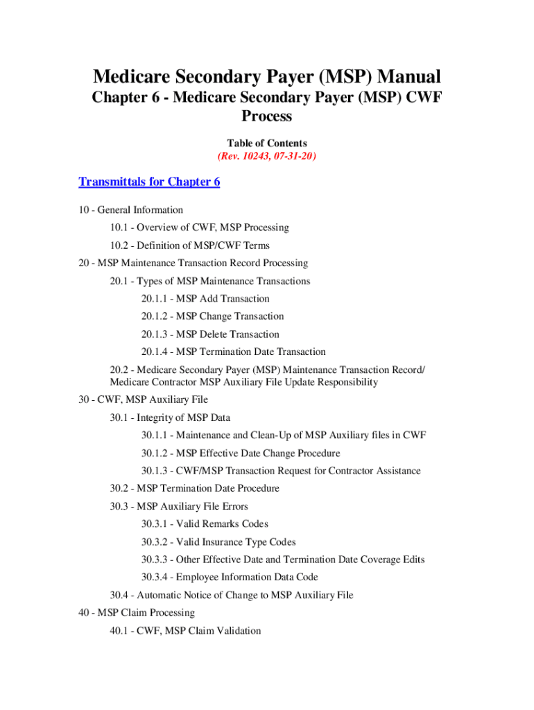 Medicare Secondary Payer (MAP) Manual Chapter 6 Medicare Secondary Payer (MAP) CWF Process Table of Contents (Rev. 10243, 073120)Transmittal for Chapter 6 10 General Information 10.1 Overview of CWF,