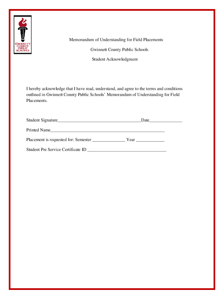 Memorandum of Understanding for Field Placements Gwinnett County Public Schools Student Acknowledgment hereby acknowledge that I have read, understand, and agree to the terms and conditions outlined