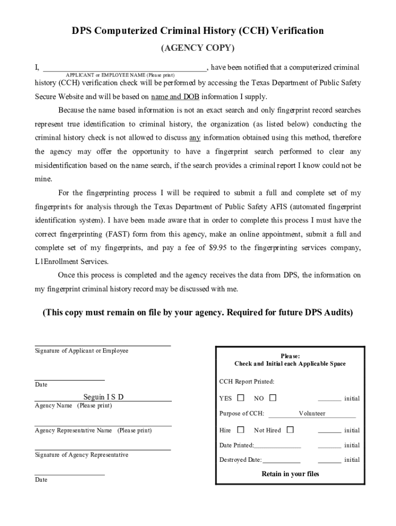 DPS Computerized Criminal History (CCH) Verification (AGENCY COPY) I, have been notified that a computerized criminal APPLICANT or EMPLOYEE NAME (Please print)history (CCH) verification check will