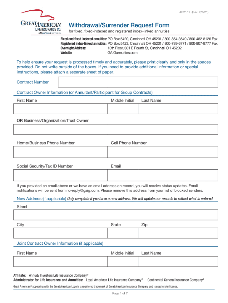 AB2151 (Rev. 7/2/21)Withdrawal/Surrender Request Form for fixed, fixed indexed and registered index-linked annuities Fixed and fixed indexed annuities: PO Box 5420, Cincinnati OH 45201 / 8008543649