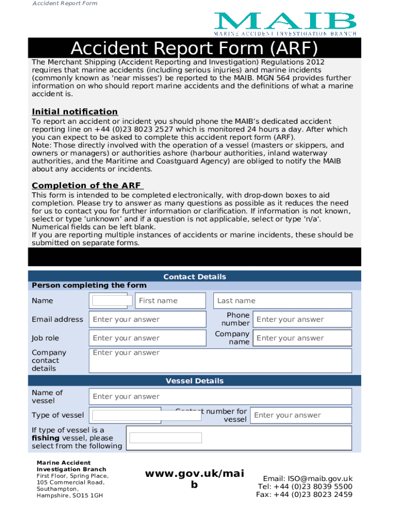 The MAIB Accident Reporting is a document required to be submitted to the required address in order to provide some info. It needs to be filled-out and signed, which can be done in hard copy, or with the help of a particular solution like PDFfiller. This tool helps to fill out any PDF or Word document right in the web, customize it according to your purposes and put a legally-binding e-signature. Once after completion, the user can send the MAIB Accident Reporting to the appropriate individual, or multiple ones via email or fax. The blank is printable too because of PDFfiller feature and options presented for printing out adjustment. Both in digital and physical appearance, your form will have got neat and professional appearance. You can also save it as the template for later, there's no need to create a new file over and over. All you need to do is to edit the ready template.