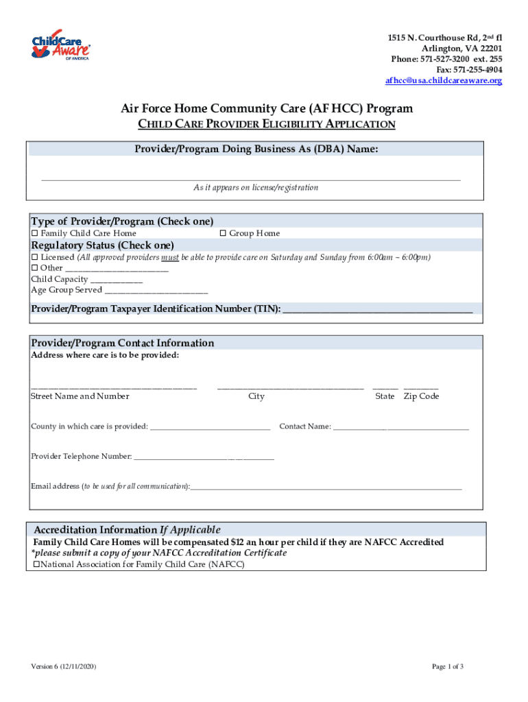 1515 N. Courthouse Rd, 2nd fl Arlington, VA 22201 Phone: 5715273200 ext. 255 Fax: 5712554904 AFC USA.childcare aware. Organ Force Home Community Care (AF HCC) Program CHILD CARE PROVIDER ELIGIBILITY