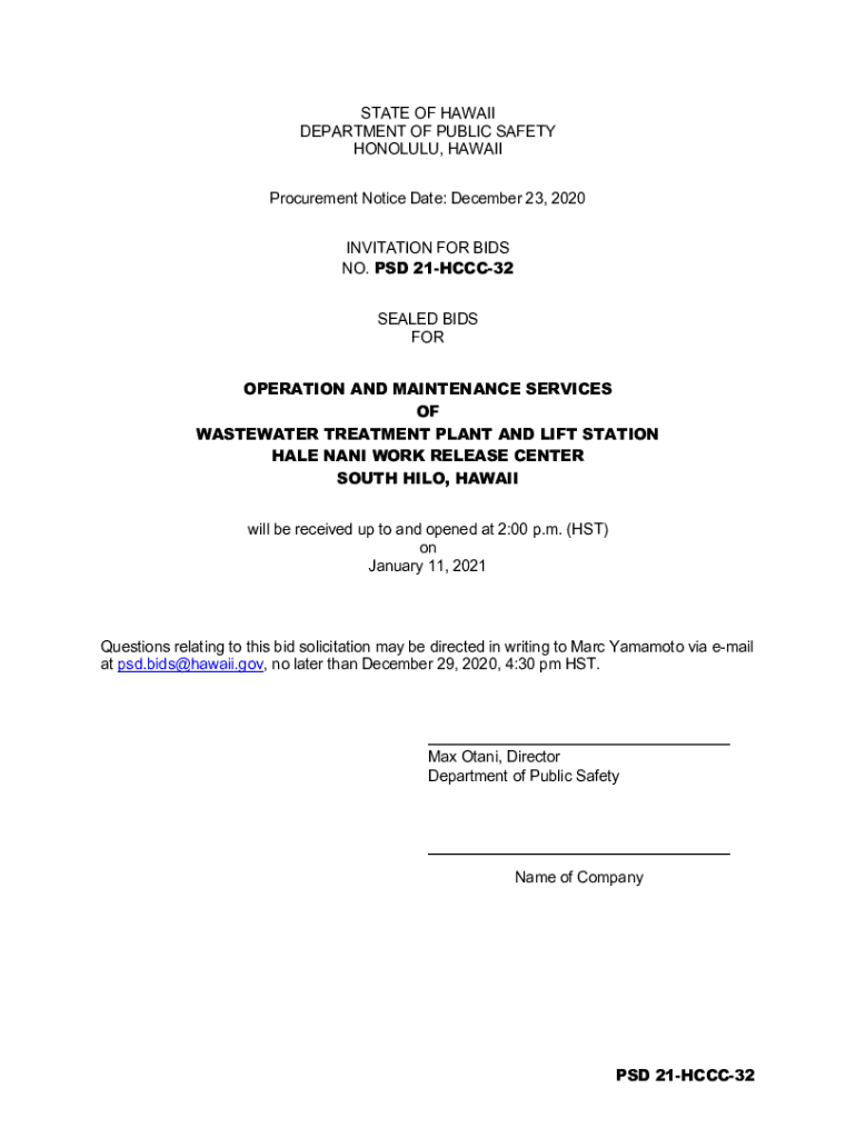 STATE OF HAWAII DEPARTMENT OF PUBLIC SAFETY HONOLULU, HAWAII Procurement Notice Date: December 23, 2020, INVITATION FOR BIDS NO. PSD 21HCCC32 SEALED BIDS FOR OPERATION AND MAINTENANCE SERVICES OF