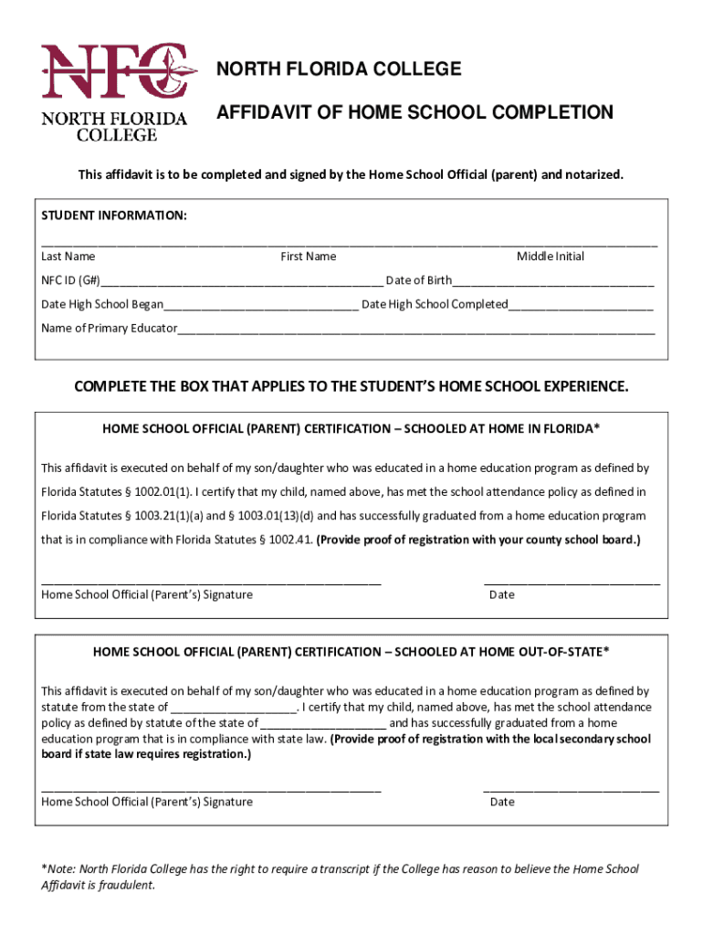 Get the free NORTH FLORIDA COLLEGE AFFIDAVIT OF HOME SCHOOL COMPLETION