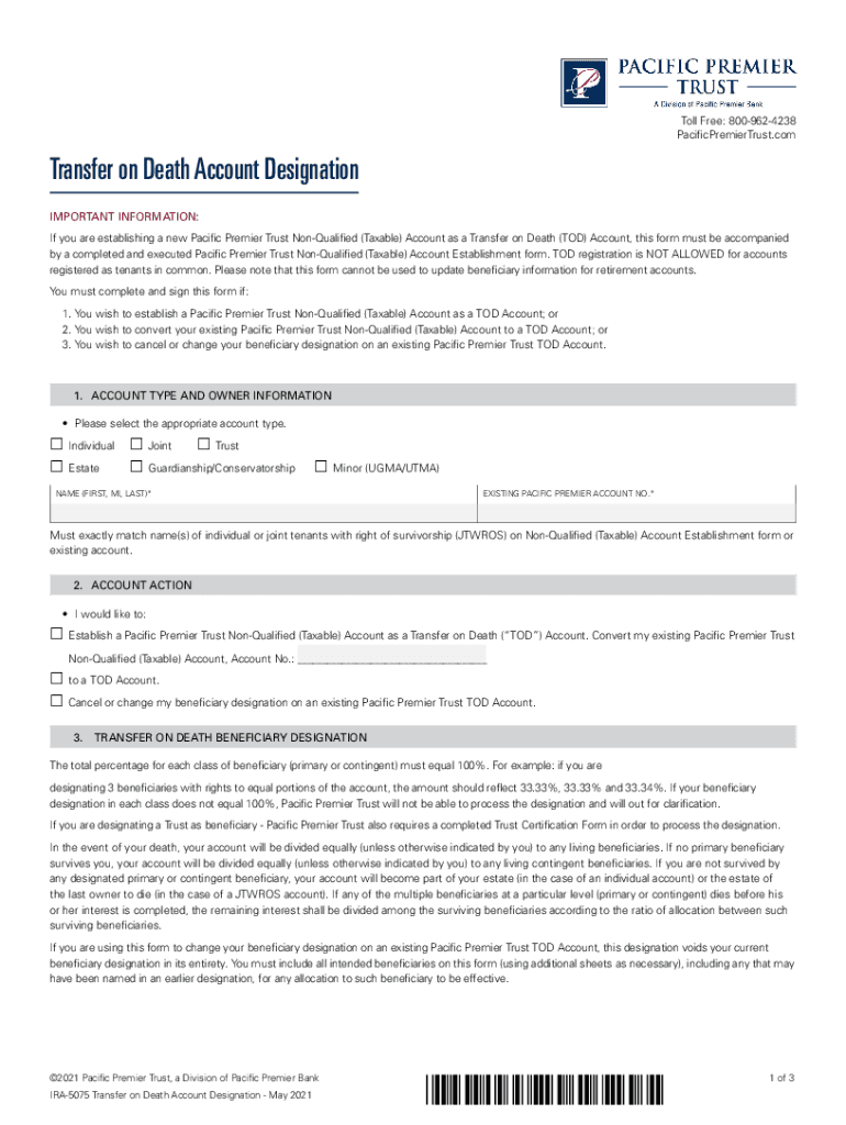Toll Free: 8009624238 PacificPremierTrust.co-transfer on Death Account Designation IMPORTANT INFORMATION: If you are establishing a new Pacific Premier Trust Unqualified (Taxable) Account as a Transfer