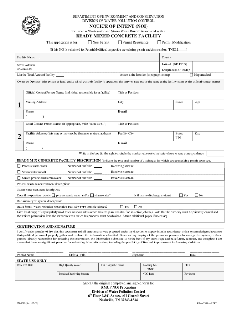 DEPARTMENT OF ENVIRONMENT AND CONSERVATION DIVISION OF WATER POLLUTION CONTROLNOTICE OF INTENT (NOI) for Process Wastewater and Storm Water Runoff Associated with already MIXED CONCRETE FACILITY This