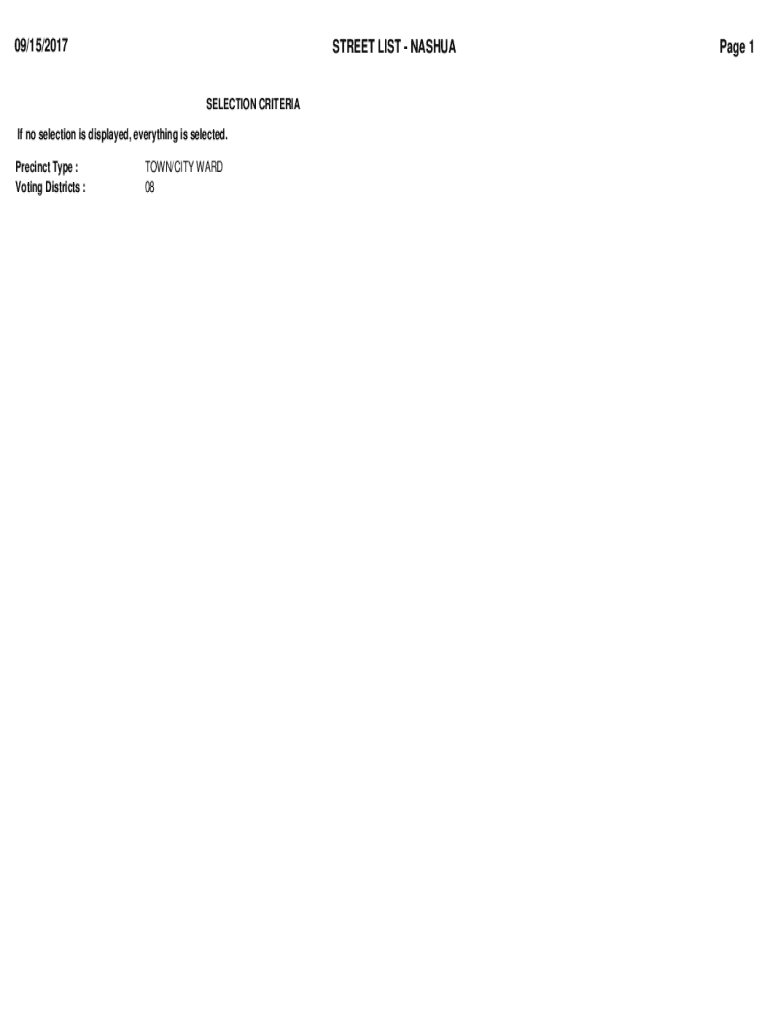 09/15/2017STREET LIST NASHUA SELECTION Criteria no selection is displayed, everything is selected. Precinct Type : Voting Districts :TOWN/CITY WARD 08Page 109/15/2017Generated By : PPIECUCHSTREET