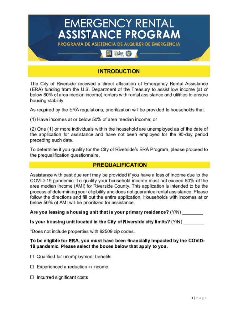 INTRODUCTION The City of Riverside received a direct allocation of Emergency Rental Assistance (ERA) funding from the U.S. Department of the Treasury to assist low income (at or below 80% of area