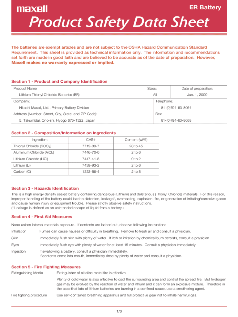 Get the free ER Battery Product Safety Data Sheet