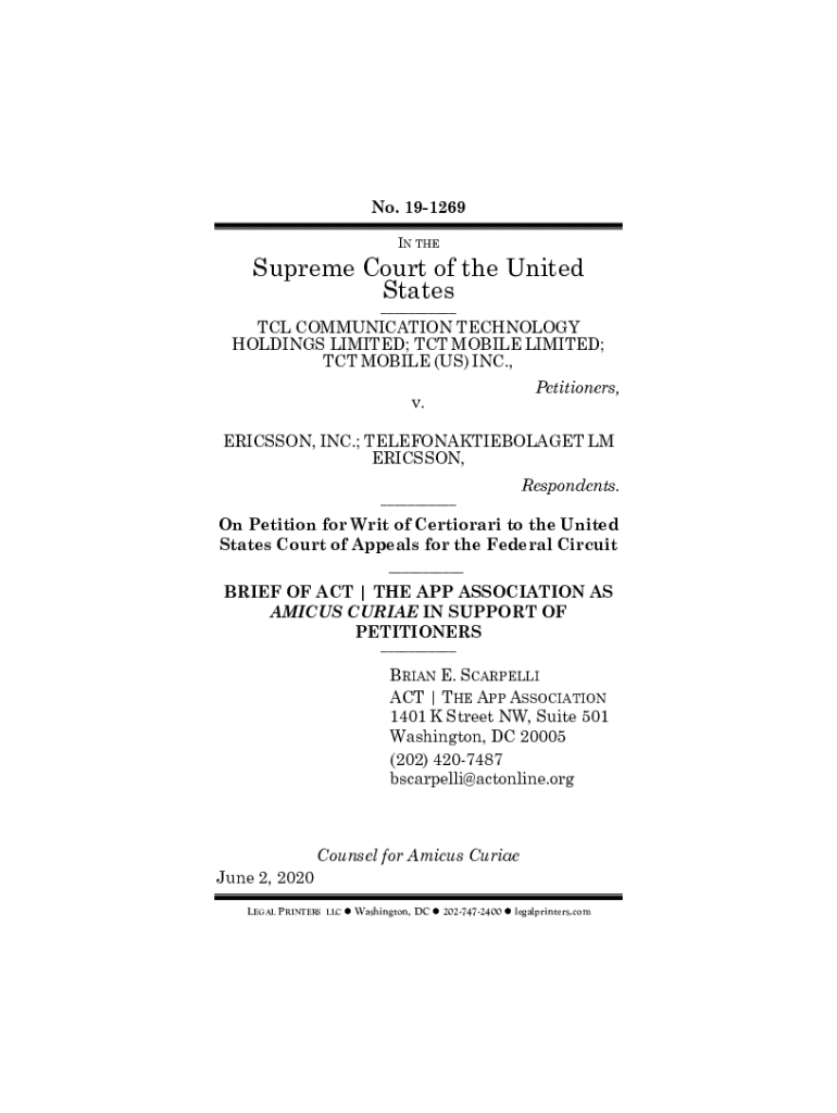 No. 191269 IN Supreme Court of the United States TCL COMMUNICATION TECHNOLOGY HOLDINGS LIMITED; ACT MOBILE LIMITED; ACT MOBILE (US) INC., v. Petitioners, ERICSSON, INC.; TELEFONAKTIEBOLAGET LM ERICSSON,