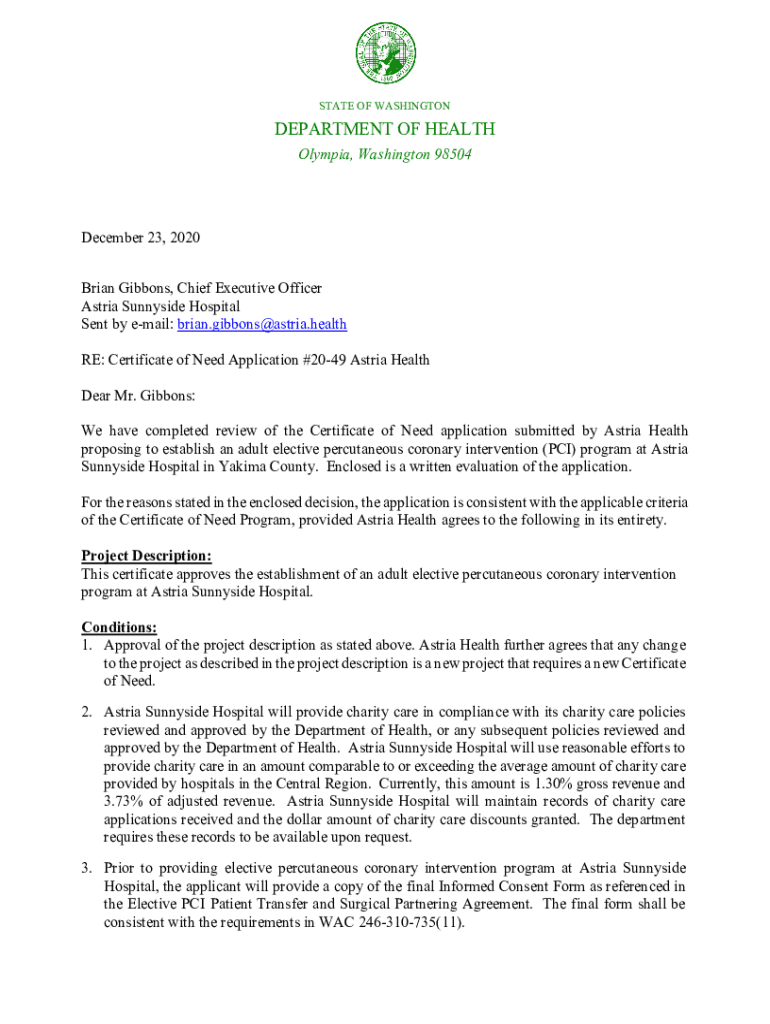 STATE OF WASHINGTONDEPARTMENT OF HEALTH Olympia, Washington 98504December 23, 2020 Brian Gibbons, Chief Executive Officer Austria Sunnyside Hospital Sent by email: brian.gibbons@astria.health RE: