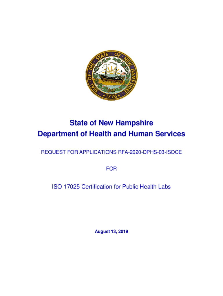 State of New Hampshire Department of Health and Human Services REQUEST FOR APPLICATIONS RFA2020DPHS03ISOCE FOR ISO 17025 Certification for Public Health Labs August 13, 2019New Hampshire Department