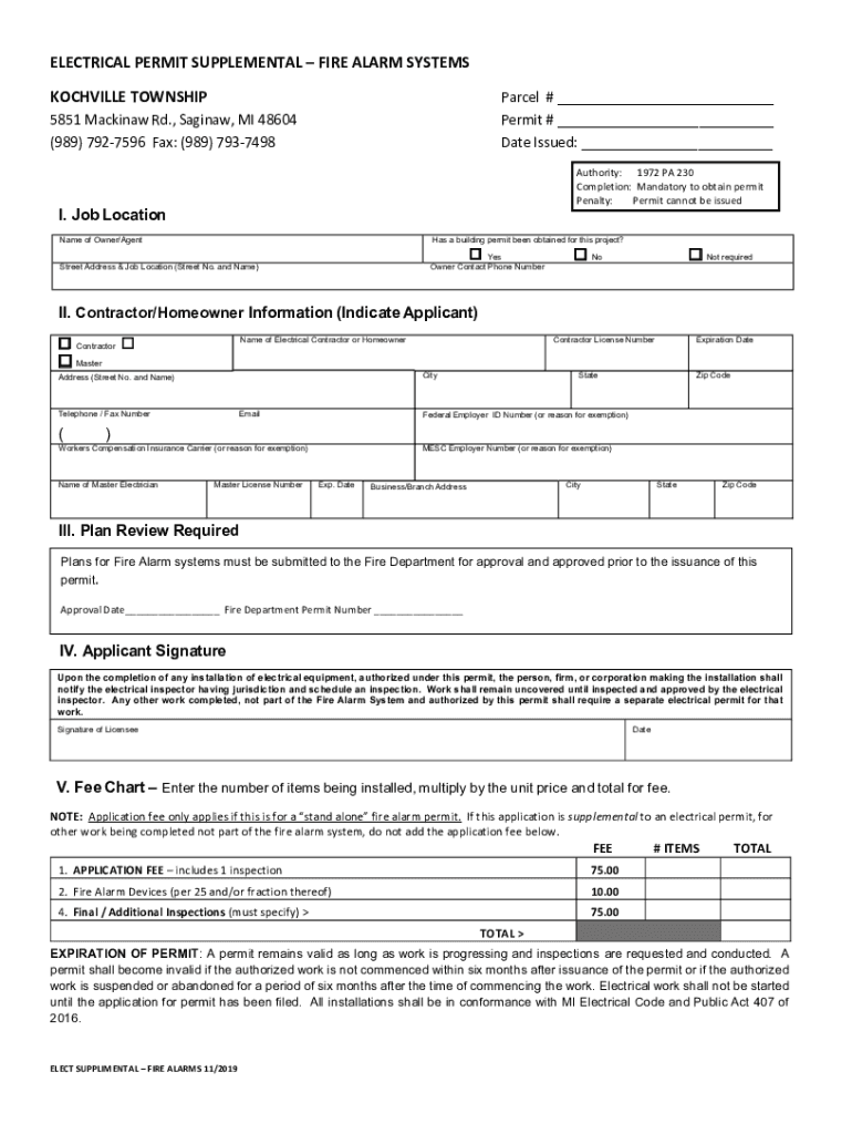 ELECTRICAL PERMIT SUPPLEMENTAL FIRE ALARM SYSTEMS ROCKVILLE TOWNSHIPParcel # Permit # Date Issued: 5851 Mackinaw Rd., Saginaw, MI 48604 (989) 7927596 Fax: (989) 7937498Authority: 1972 PA 230 Completion: