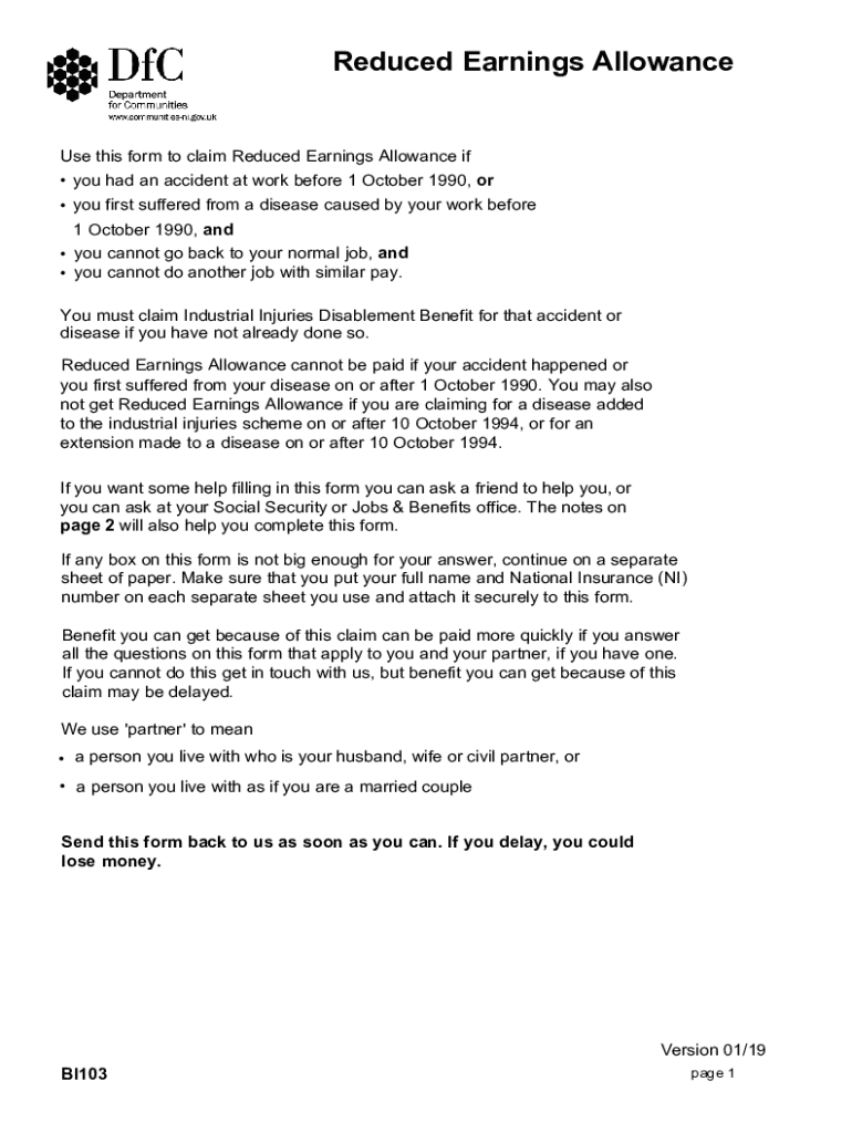 Get the free BI103 Reduced Earnings Allowance. BI103 Reduced Earnings Allowance