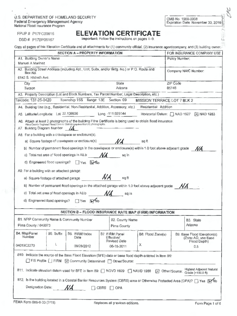 U.S. DEPARTMENT OF HOMELAND SECURITY Federal Emergency Management Agency National Flood Insurance Program0MB No. 16600008 Expiration Date: November 30, 2018FPUP # P17FC00615ELEVATION CERTIFICATE DSD