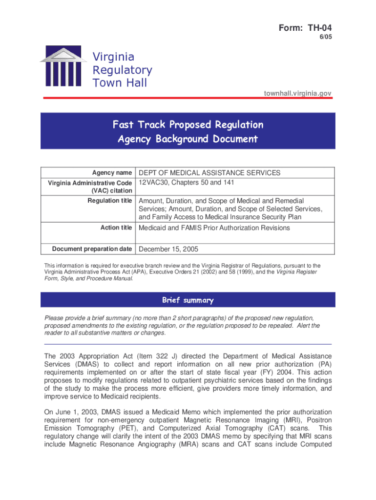 Form: TH04 6/05townhall. Virginia.agency named OF MEDICAL ASSISTANCE SERVICES Virginia Administrative Code 12VAC30, Chapters 50 and 141 (VAC) citation Regulation titillation title Document preparation