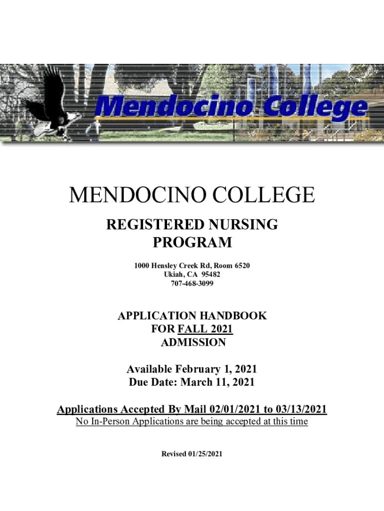 MENDOCINO COLLEGE REGISTERED NURSING PROGRAM 1000 Hensley Creek Rd, Room 6520 Uriah, CA 95482 7074683099APPLICATION HANDBOOK FOR FALL 2021 ADMISSION Available February 1, 2021, Due Date: March 11,