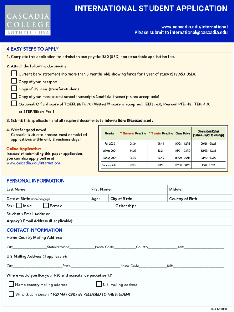 INTERNATIONAL STUDENT APPLICATION ASC ASIA COLLEGEwww.cascadia.edu/international Please submit to international@cascadia.eduBOTHELL USA4 EASY STEPS TO APPLY 1. Complete this application for admission