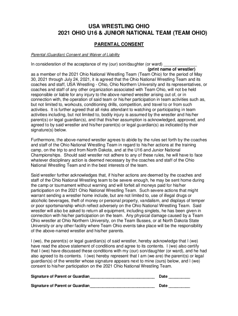 USA WRESTLING OHIO 2021 OHIO U16 & JUNIOR NATIONAL TEAM (TEAM OHIO) PARENTAL CONSENT Parental (Guardian) Consent and Waiver of Liability In consideration of the acceptance of my (our) son/daughter