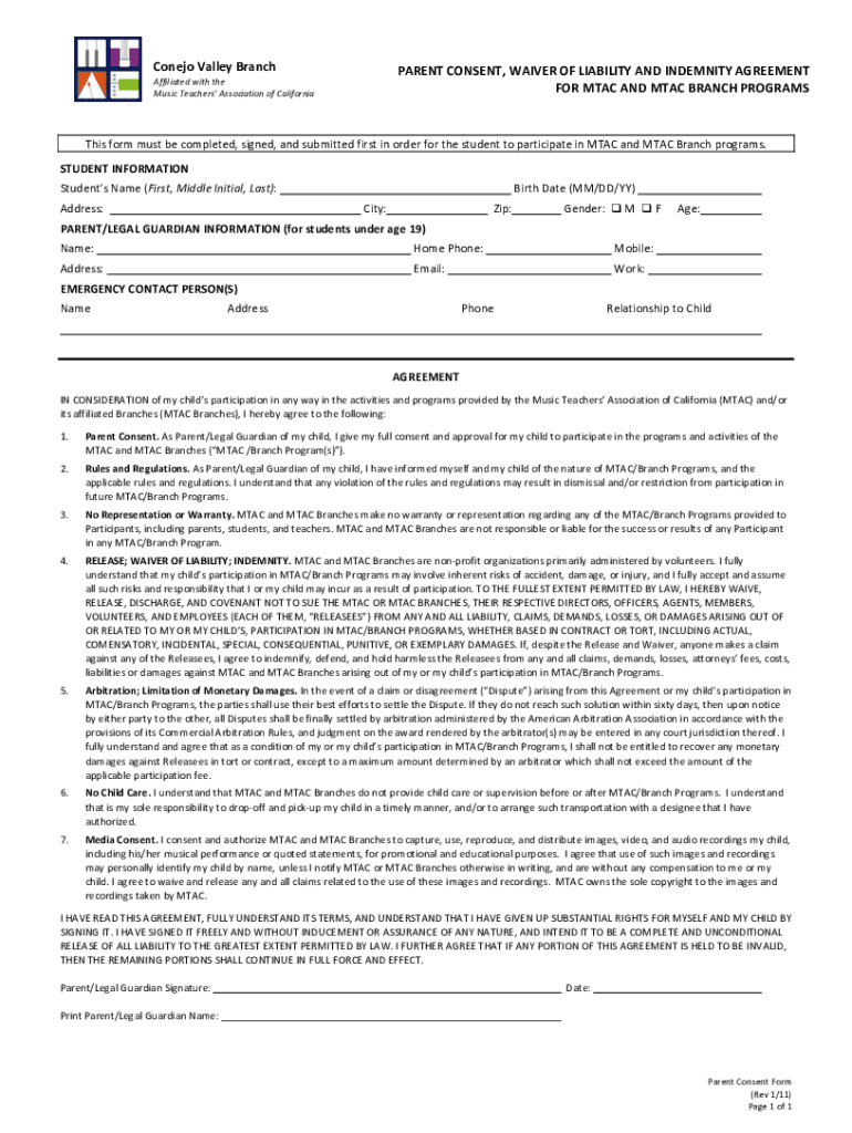 Cone Valley Transparent CONSENT, WAIVER OF LIABILITY AND INDEMNITY AGREEMENT FORM TAC AND MAC BRANCH PROGRAMSAffiliated with the Music Teachers Association of Californians form must be completed,