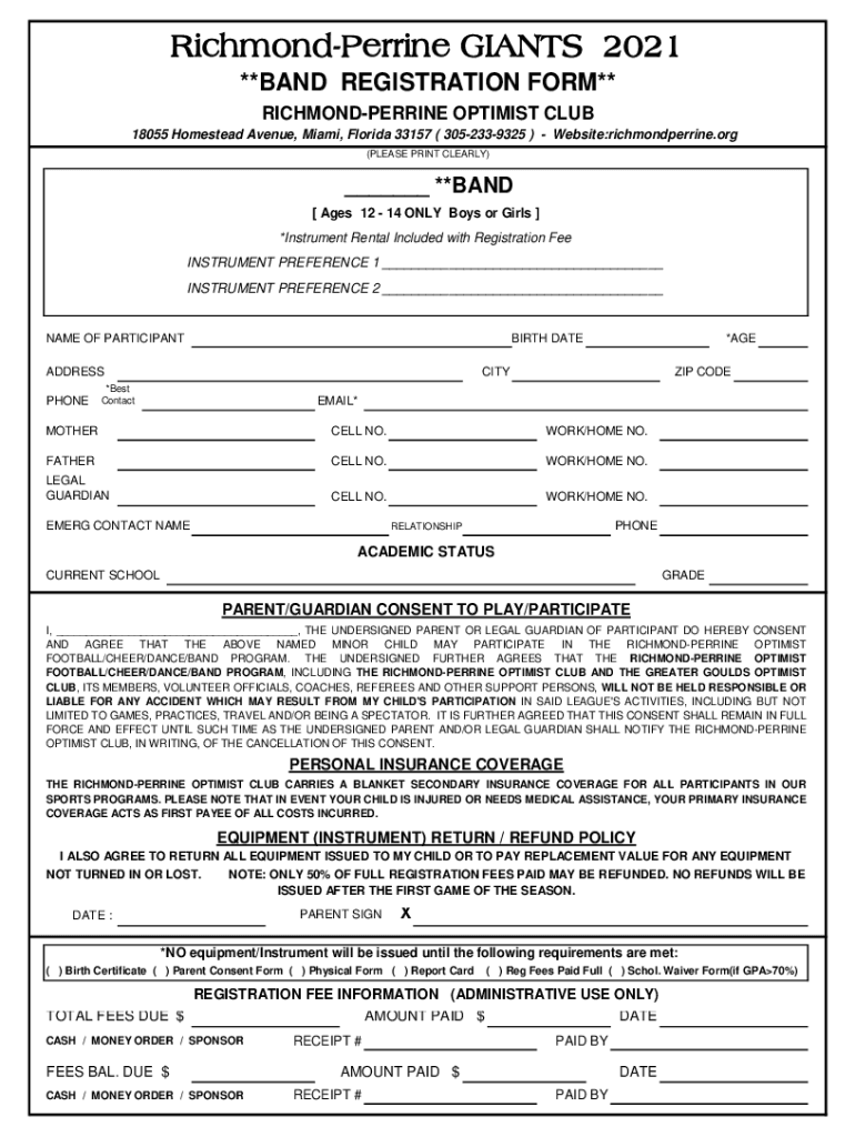 RichmondPerrine GIANTS 2021 **BAND REGISTRATION FORM** RICHMONDPERRINE OPTIMIST CLUB 18055 Homestead Avenue, Miami, Florida 33157 (3052339325) Website:richmondperrine.org (PLEASE PRINT CLEARLY) **BAND