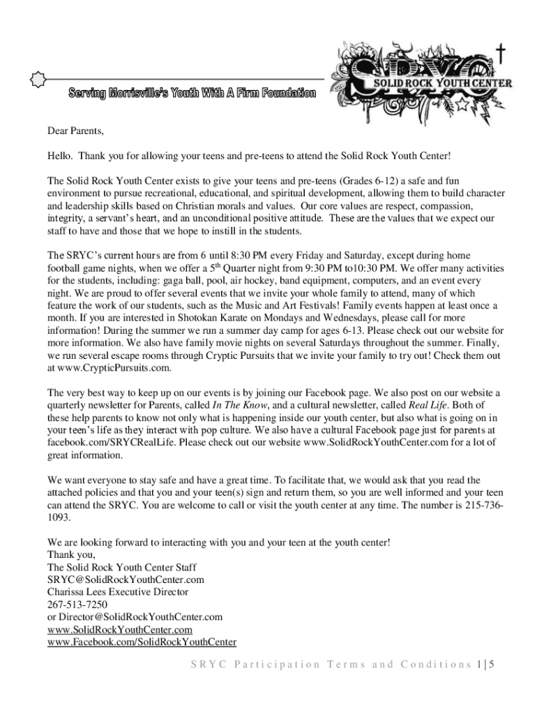 Get the free Thank you for allowing your teens and pre-teens to attend the Solid Rock Youth Center