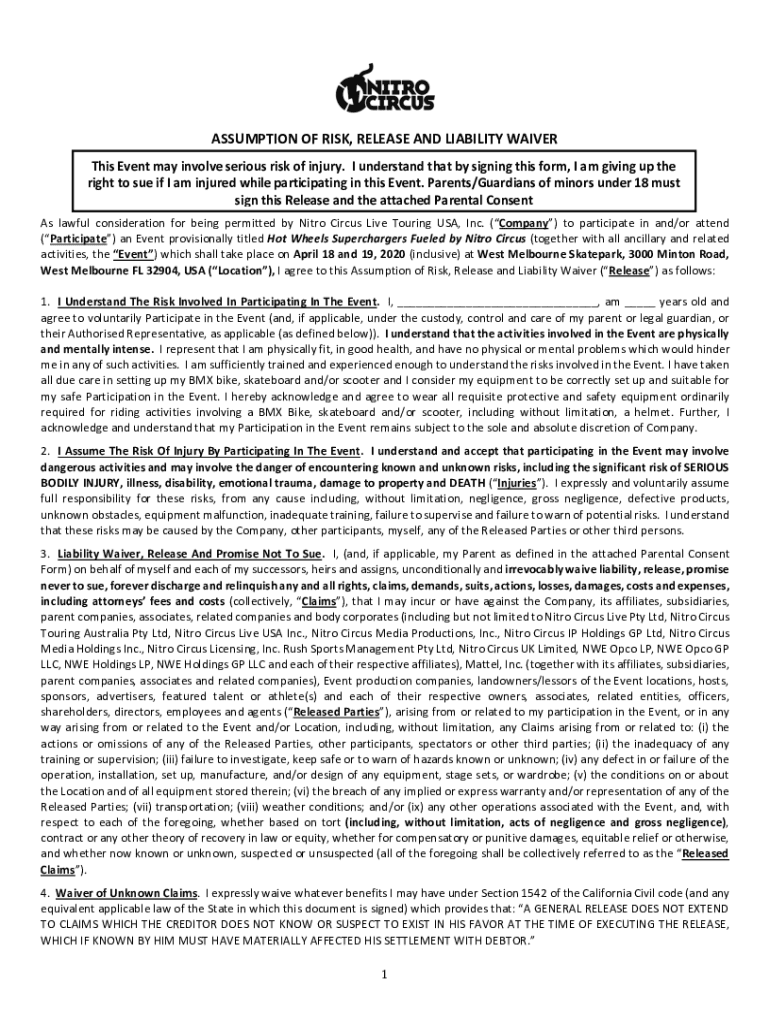 Get the free Assumption of Risk Release Liability Waiver (Superchargers) - West Melbourne FL 2020...
