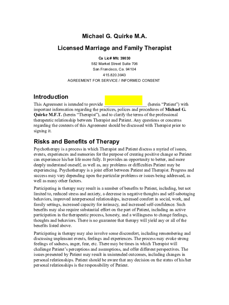 Michael G. Quirky M.A. Licensed Marriage and Family Therapist Ca LIC# MFC 39030 582 Market Street Suite 706 San Francisco, Ca. 94104 415.820.3943 AGREEMENT FOR SERVICE / INFORMED CONSENTIntroduction