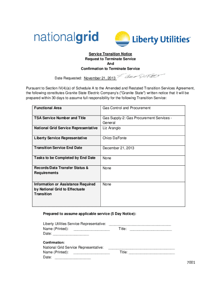 Service Transition Notice Request to Terminate Service And Confirmation to Terminate Service Date Requested: November 21, 2013, Pursuant to Section IV(4)(a) of Schedule A to the Amended and Restated