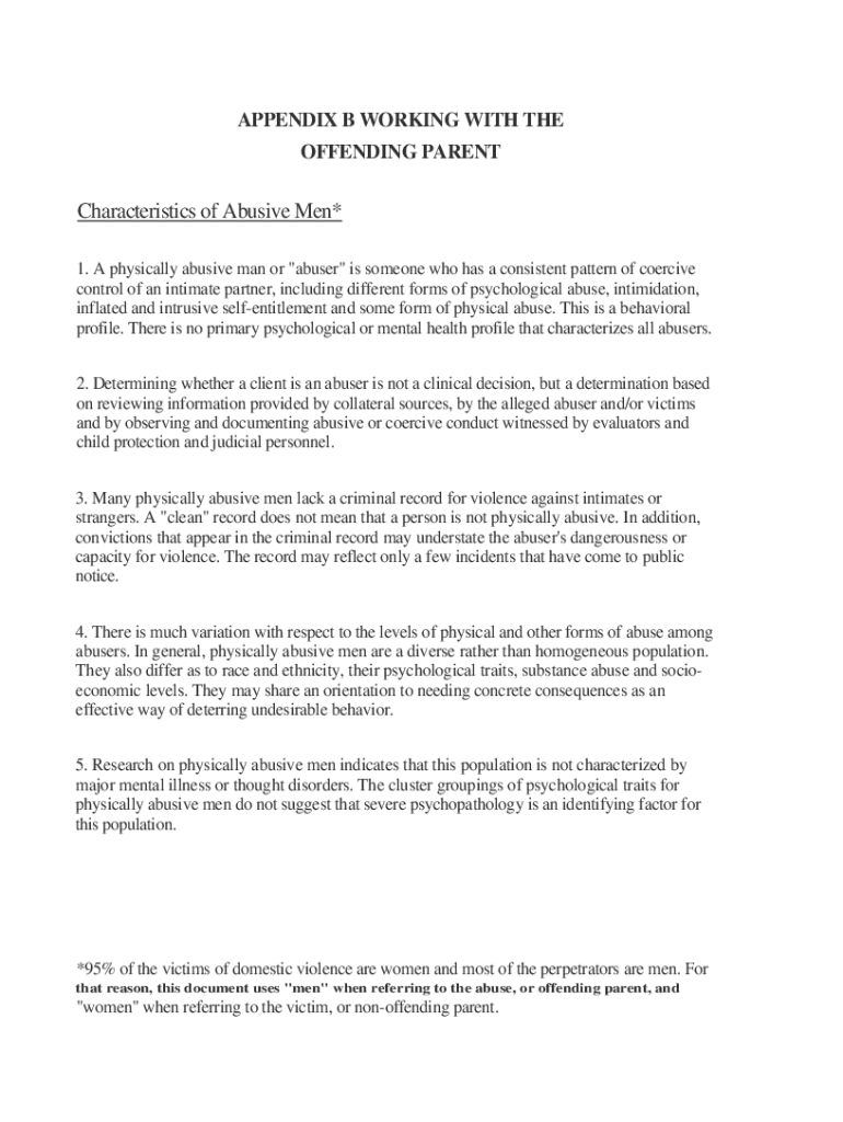 APPENDIX B WORKING WITH OFFENDING PARENTCharacteristics of Abusive Men×1. A physically abusive man or “abuser is someone who has a consistent pattern of coercive control of an intimate partner,