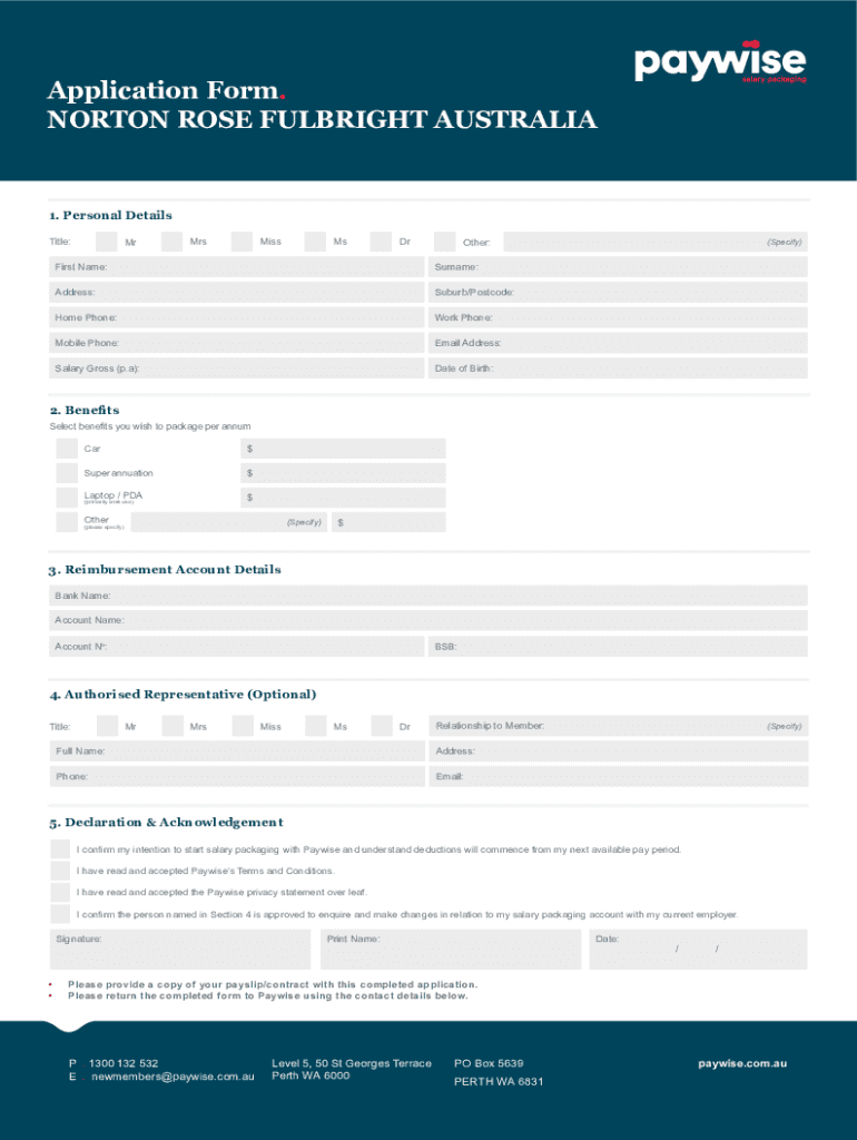 Application Form. NORTON ROSE FULBRIGHT AUSTRALIA1. Personal Details Title:MrMrsMissMsDrOther:First Name:Surname:Address:Suburb/Postcode:Home Phone:Work Phone:Mobile Phone:Email Address:Salary Gross