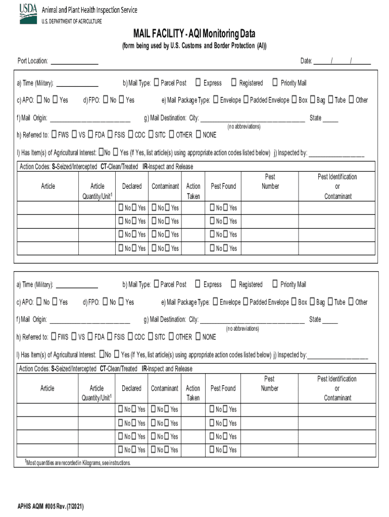 MAIL FACILITY AQI Monitoring Data(form being used by U.S. Customs and Border Protection (AI)) Port Location:Date:a) Time (Military): c) APO:Nob) Mail Type: Yes) FPO:NoYesFWSVSFDAI) Has Item(s) of