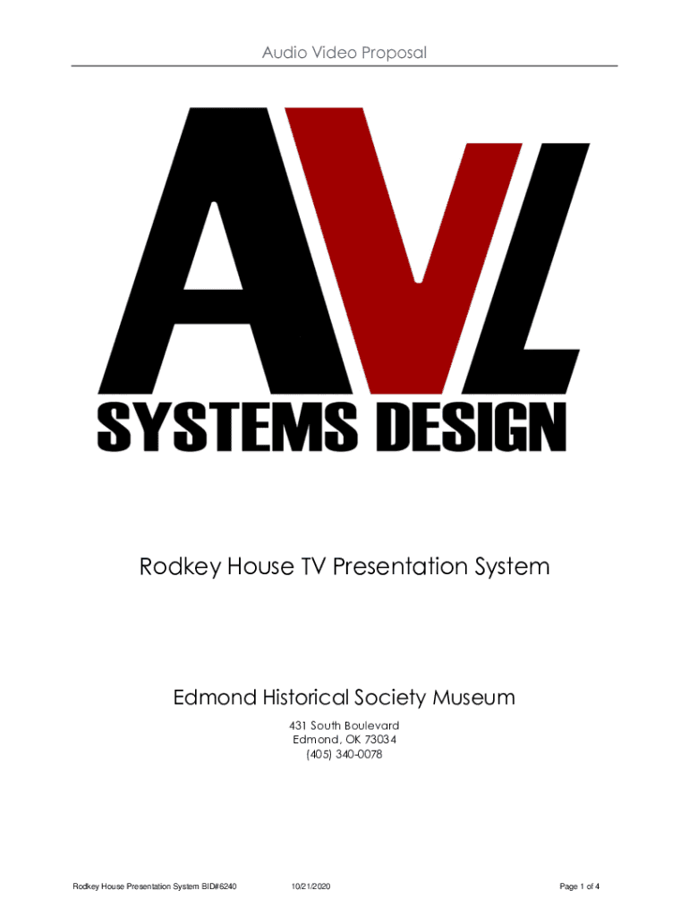 Audio Video ProposalRodkey House TV Presentation System Edmond Historical Society Museum 431 South Boulevard Edmond, OK 73034 (405) 3400078Rodkey House Presentation System BID#624010/21/2020Page 1