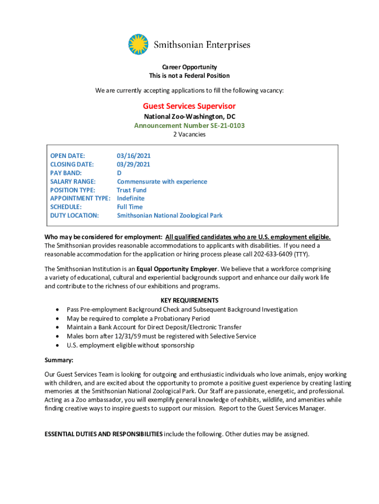 Career Opportunity This is not a Federal Position We are currently accepting applications to fill the following vacancy:Guest Services SupervisorNational Zoo Washington, DC Announcement Number SE210103