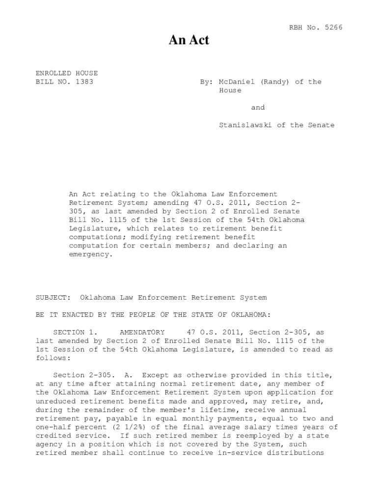 RBC No. 5266An Act ENROLLED HOUSE BILL NO. 1383By: McDaniel (Randy) of the House and Stanislavsky of the Senate Act relating to the Oklahoma Law Enforcement Retirement System; amending 47 O.S. 2011,