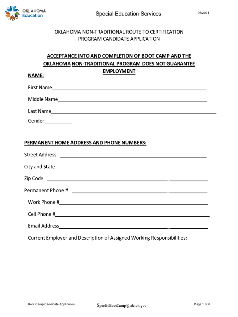 Special Education Services06/2021OKLAHOMA NONTRADITIONAL ROUTE TO CERTIFICATION PROGRAM CANDIDATE APPLICATION ACCEPTANCE INTO AND COMPLETION OF BOOT CAMP AND THE OKLAHOMA NONTRADITIONAL PROGRAM DOES