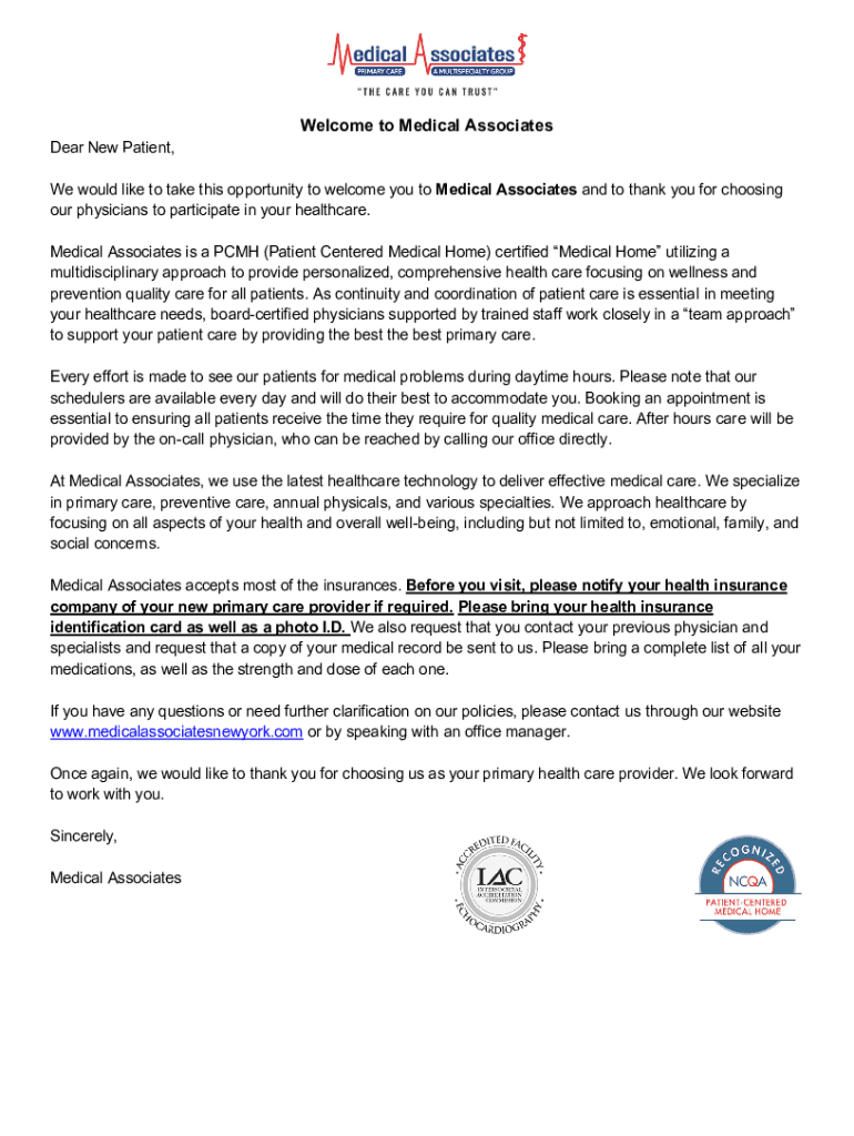Welcome to Medical Associates Dear New Patient, We would like to take this opportunity to welcome you to Medical Associates and to thank you for choosing our physicians to participate in your healthcare.