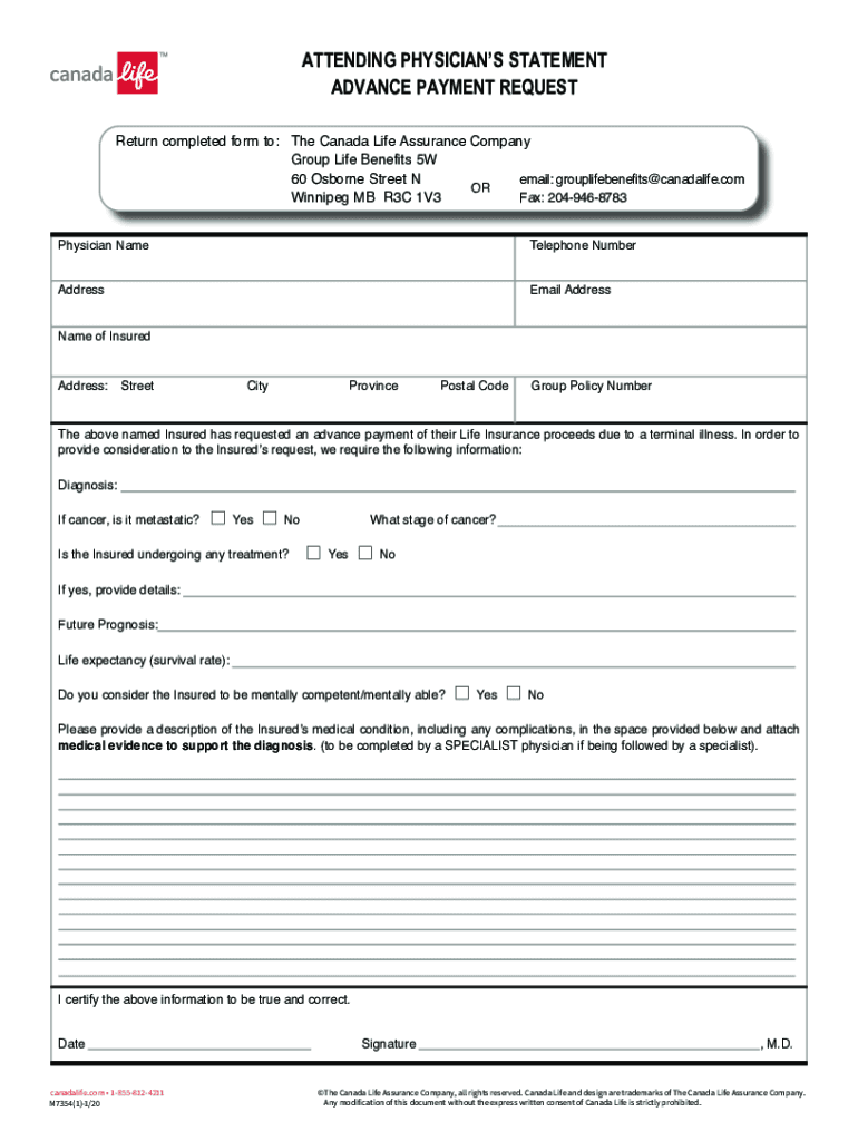 ATTENDING PHYSICIANS STATEMENT ADVANCE PAYMENT REQUEST Return completed form to: The Canada Life Assurance Company Group Life Benefits 5W email: grouplifebenefits@canadalife.com 60 Osborne Street