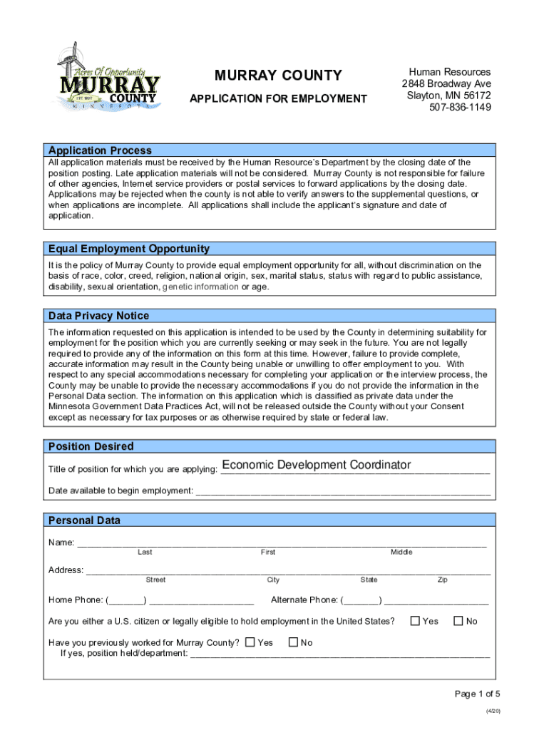 MURRAY Countryman Resources 2848 Broadway Ave Clayton, MN 56172 5078361149APPLICATION FOR EMPLOYMENTApplication Processable application materials must be received by the Human Resources Department