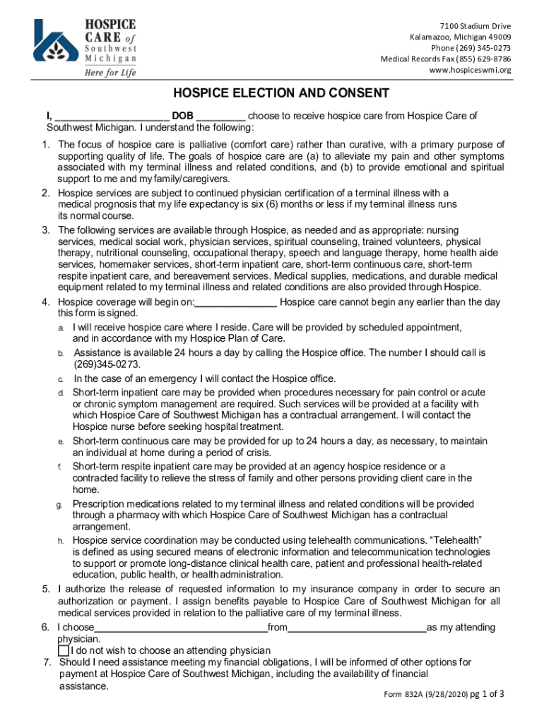 7100 Stadium Drive Kalamazoo, Michigan 49009 Phone (269) 3450273 Medical Records Fax (855) 6298786 www.hospiceswmi.orgHOSPICE ELECTION AND CONSENT I, DOB choose to receive hospice care from Hospice