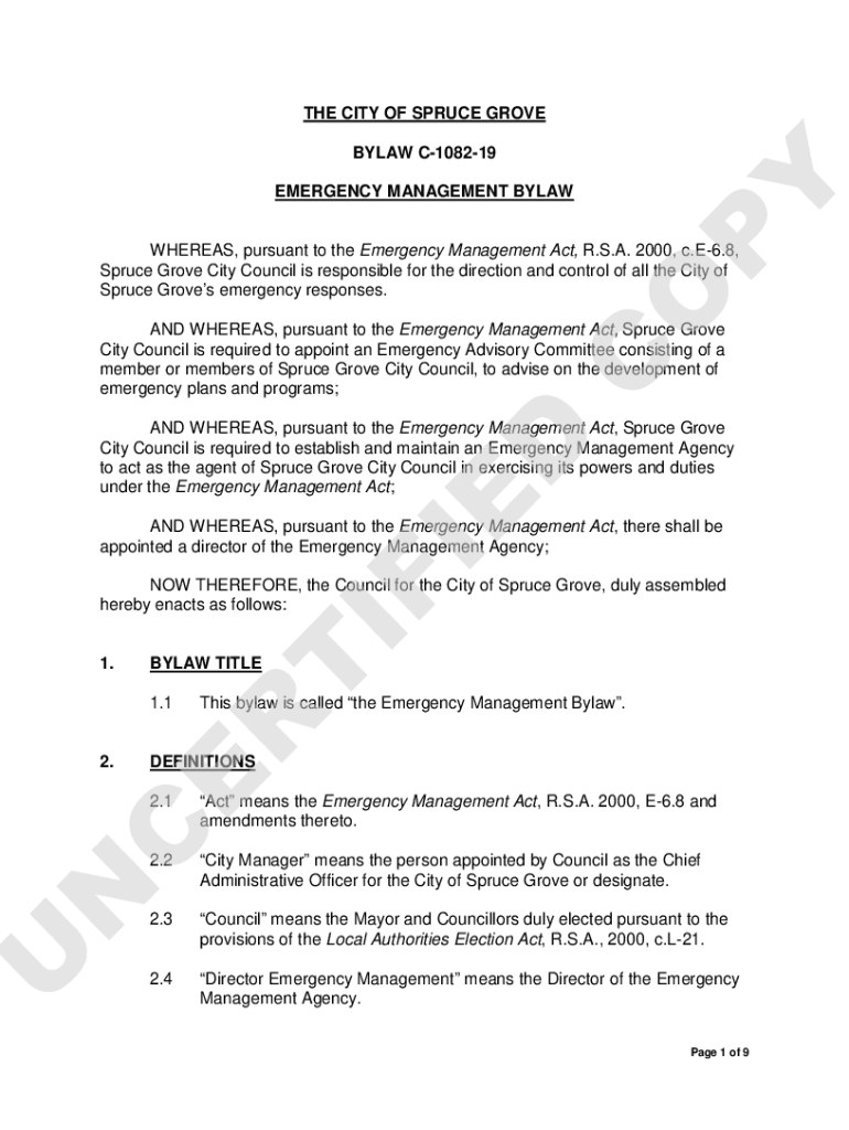 Get the free Bylaw C-1082-19 Emergency Management Bylaw