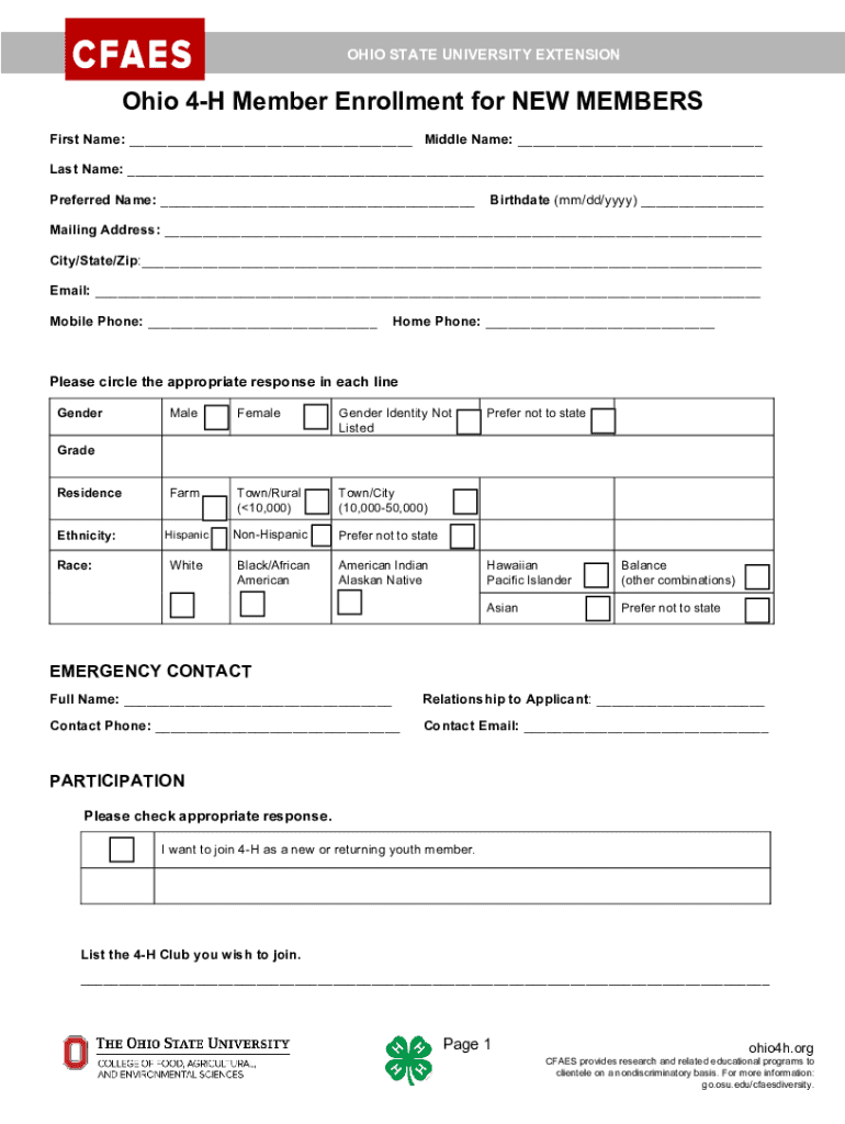 OHIO STATE UNIVERSITY EXTENSION Ohio 4H Member Enrollment for NEW MEMBERS UNIT/DEPARTMENT/CAMPUS IDENTIFICATION HERE First Name: Middle Name: Last Name: Preferred Name: Birthdate (mm/dd/YYY) Mailing