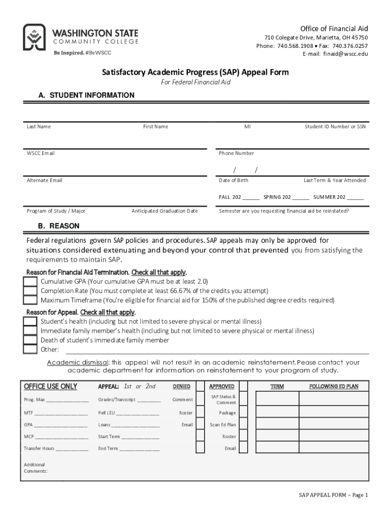 Office of Financial Aid 710 Colgate Drive, Marietta, OH 45750 Phone: 740.568.1908 Fax: 740.376.0257 Email: fin aid SCC.satisfactory Academic Progress (SAP) Appeal Form For Federal Financial Aid A.