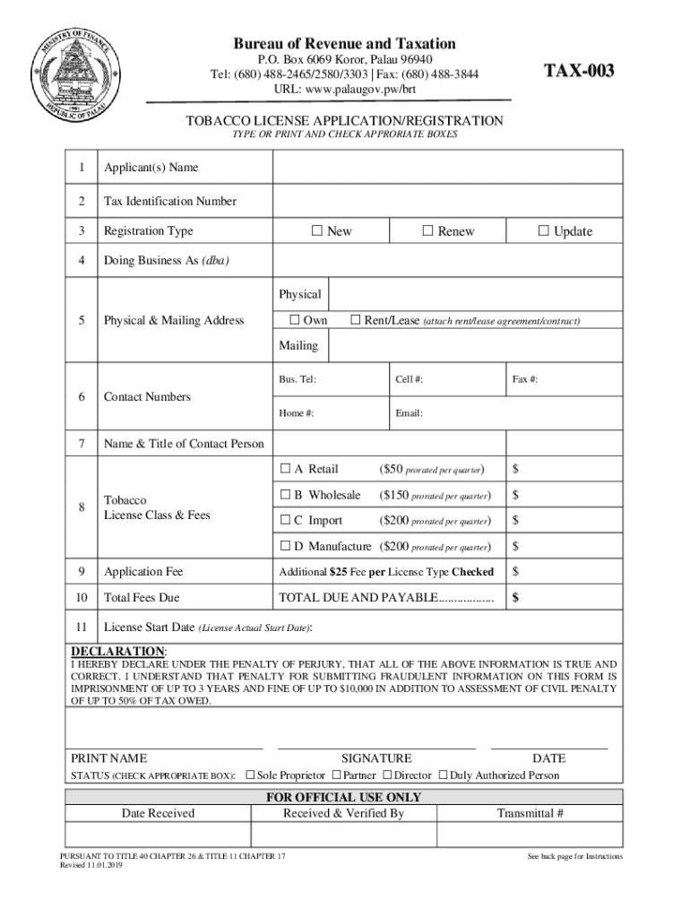 Bureau of Revenue and Taxation P.O. Box 6069 Color, Paley 96940 Tel: (680) 4882465/2580/3303 Fax: (680) 4883844 URL: www.palaugov.pw/brtTAX003TOBACCO LICENSE APPLICATION/REGISTRATION TYPE OR PRINT