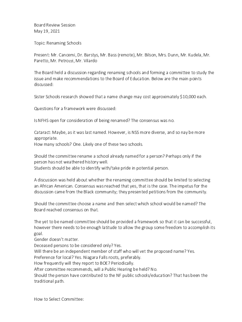 BoardReviewSession May19,2021 Topic:RenamingSchools Present:Mr. Cancer, Dr. Bursts, Mr. Bass(remote), Mr. Wilson, Mrs. Dunn, Mr. Judea, Mr. Pareto, Mr. Petrol, Mr. Ricardo TheBoardheldadiscussionregardingrenamingschoolsandformingacommitteetostudythe