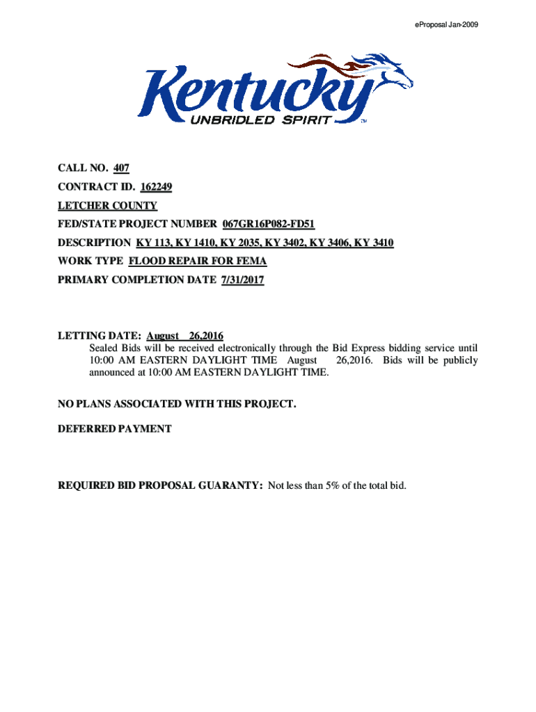 Proposal Jan2009CALL NO. 407 CONTRACT ID. 162249 FLETCHER COUNTY FED/STATE PROJECT NUMBER 067GR16P082FD51 DESCRIPTION KY 113, KY 1410, KY 2035, KY 3402, KY 3406, KY 3410 WORK TYPE FLOOD REPAIR FOR